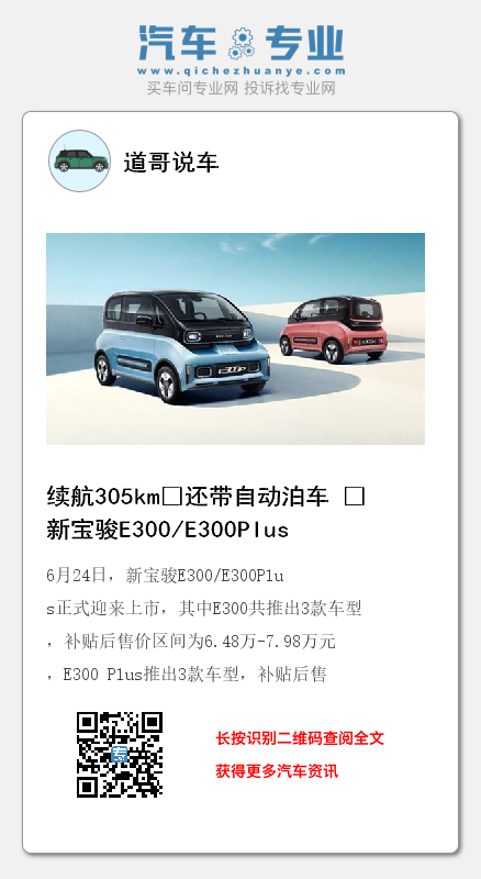 6月24日,新宝骏E300/E300Plus正式迎来上市,其中E300共推出3款车型,补贴后售价区间为6.48万-7.98万元,E300 Plus推出3款车型,补贴后售价区间为6.98万-8.48万元。与此同时,为了方便消费者购车,新宝骏还推出了包括动力电池总成享8年或12万公里质保、3年免费道路救援等五重智选大礼包。