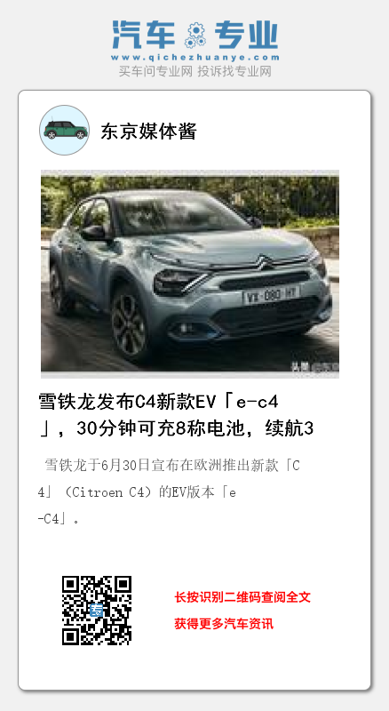 雪铁龙于6月30日宣布在欧洲推出新款「C4」(Citroen C4)的EV版本「e-C4」。
