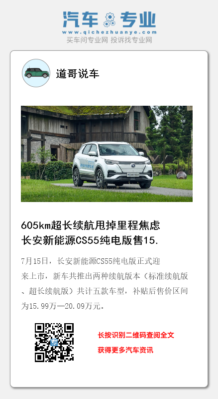 7月15日,长安新能源CS55纯电版正式迎来上市,新车共推出两种续航版本(标准续航版、超长续航版)共计五款车型,补贴后售价区间为15.99万—20.09万元。其中标准续航版车型的NEDC工况续航里程为403km,超长续航版车型的NEDC工况续航里程为605km。与此同时,长安新能源还推出了包括“座”享购车、“座”享服务、“座”享保值的“座”享其诚购车大礼包。值得一提的是,在“座”享服务计划中,终身免费三电质保、终身免费管家服务、免费送充电桩等服务条款,更近一步打消了消费者购车后的用车烦恼。
