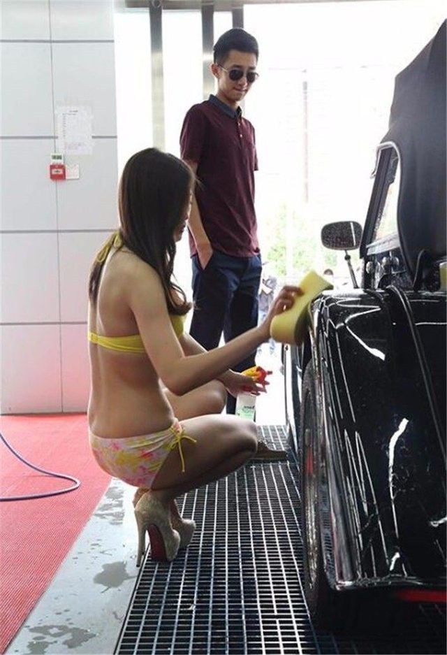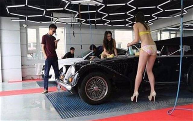 原来在这家洗车店,不像一般的洗车,除了豪车之外,还有三位比基尼美女一同帮你洗车,穿着高跟鞋,相貌还不差。