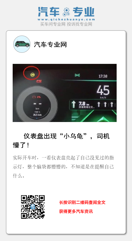 为了确认,尚女士拍了一张照片,发给了自己的老公,他俩研究半天也不知道啥意思,也不好意思问别人,为了安全起见,随后尚女士赶紧把车开到了修理厂,想让修理工检修一下,到了修理厂,尚女士才得知这并不是什么严重的事情,但是车子的确出了一定的问题,还是可以开的。