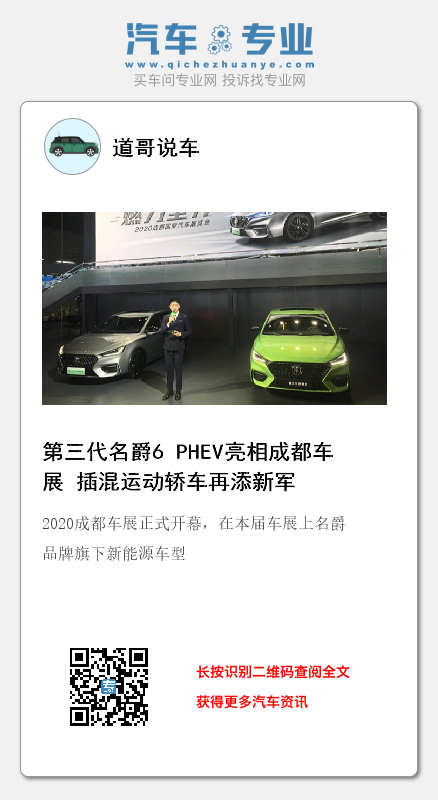 2020成都车展正式开幕,在本届车展上名爵品牌旗下新能源车型——第三代名爵6 PHEV迎来首发,新车基于燃油版车型的外观打造,并采用了一套插电式混合动力系统。名爵6 PHEV拥有诸多性能优势:纯电续航可达70公里、百公里综合油耗仅为1.1L、拥有L2.5 PLUS智能驾驶系统、搭载第二代10速EDU智能电驱变速箱等。