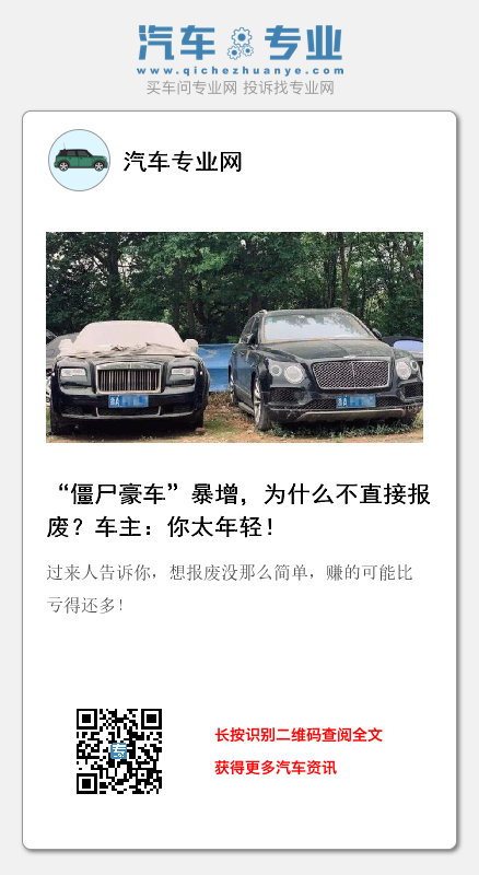 不管在路上、小区、还是在停车场,都有随处可见的"僵尸车",劳斯莱斯、宾利、野马甚至奔驰大G,不禁让人疑问重重,为什么车主不直接去报废拿补贴,宁愿停在路边呢?过来人告诉你,想报废没那么简单,赚的可能比亏得还多!