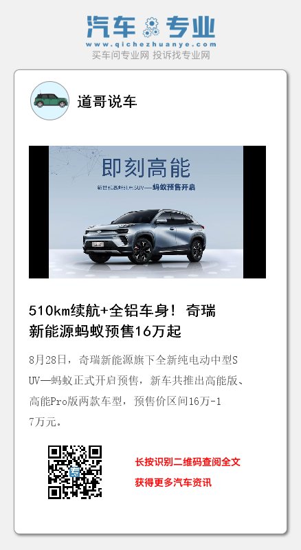 全铝车身、510km的续航里程、丰富的智能化配置等,蚂蚁表现出来的能量不可谓不足。尤其是作为一款中型纯电SUV,16万起的预售价格也让其拥有了不小的优势。当然,@LIFE平台绿色智慧模块化技术平台的公布,更让外界看到了奇瑞新能源在核心技术领域的进步和突破,而随着越来越多的车型在该平台下诞生,奇瑞新能源的未来将不可限量。
