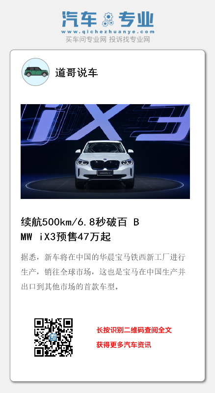 9月13日,备受瞩目的创新纯电动BMW iX3正式在中国首发并开启预售,新车共推出领先型和创领型两款车型,预售价分别为47万元和51万元。与此同时,针对BMW iX3用户,宝马还推出了包括一年免费公共充电以及6年/12万公里免费保养的预售大礼包。
