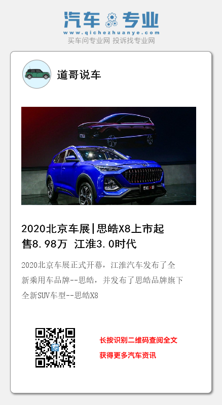 2020北京车展正式开幕,江淮汽车发布了全新乘用车品牌--思皓,并发布了思皓品牌旗下全新SUV车型--思皓X8。新车共推出8款车型,售价区间为8.98-12.98万元。此外,新车上市即优惠6000元,并提供多款优惠礼包,优惠后的售价区间为8.38-12.98万元。江淮汽车集团副总经济师、乘用车营销公司总经理张文根在介绍思皓X8时表示,思皓乘用车已实现全面对标、全线达标、全速共标,将引领以用户体验为中心的乘用车3.0时代行稳致远。