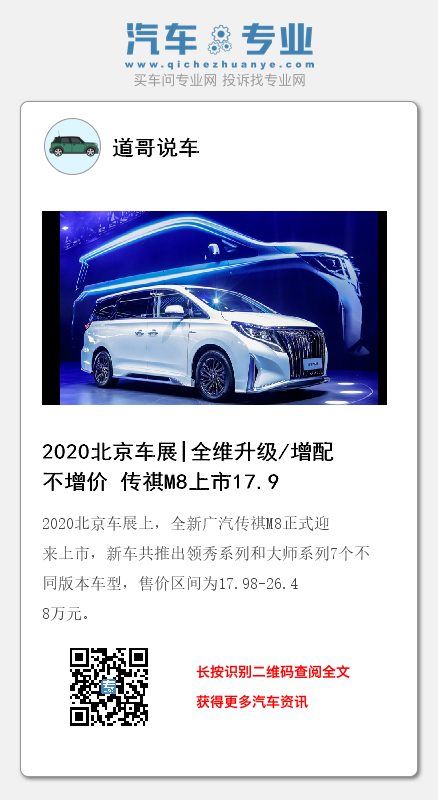 近日广汽传祺发布了全新营销战略——“金三角战略”,力求通过“产品增值、科技增值和服务增值”三大举措,实现“为消费者增值、为经销商增益、为传祺发展赋能”三大目标。其中,作为广汽传祺冲击高端市场的代表车型,传祺GM8也在全新的营销战略下迎来了焕新。2020北京车展上,全新广汽传祺M8正式迎来上市,新车共推出领秀系列和大师系列7个不同版本车型,售价区间为17.98-26.48万元。