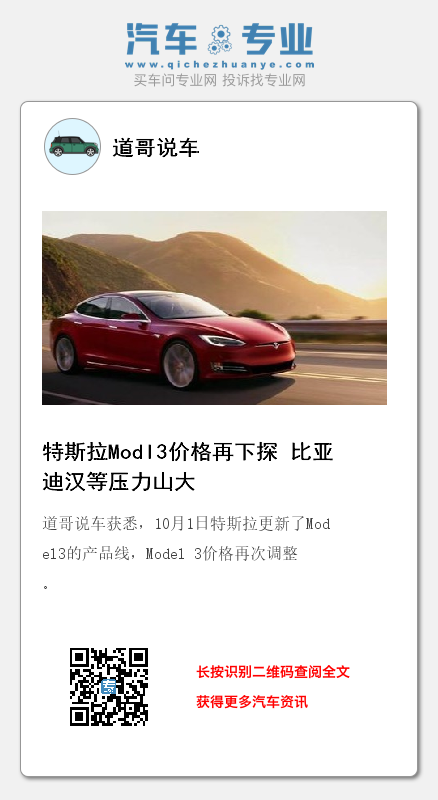 此前,Model 3标准续航升级版车型售价为29.18万元,长续航后轮驱动版车型售价为34.41万元,在此基础上,还可享受新能源补贴。这就意味着,经过10月1日的最新调价,国产Model 3标准续航升级版补贴后售价降低2.165万元,国产Model 3长续航后轮驱动版售价降低3.415万元。