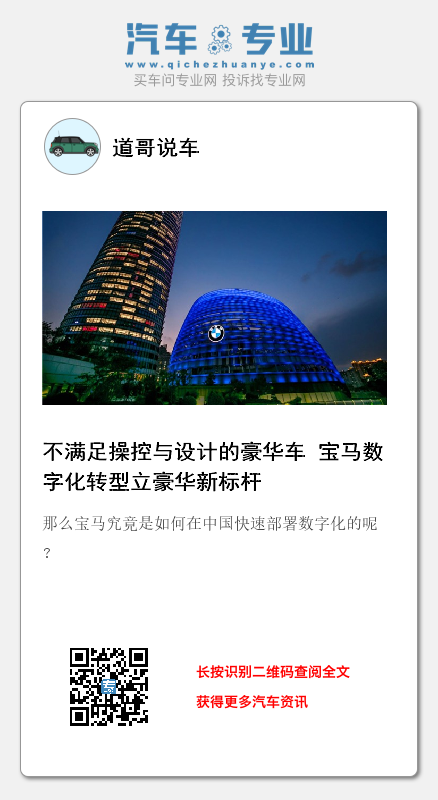 综合来看,宝马的数字化进程是坚定的,是有计划的,同时也是富有成效的。无论是在软件技术方面还是用户、经销商以及组织架构方面,宝马的数字化进程都在有条不紊的进行。正如高乐所说:“数字化不仅是技术的变革,归根到底是整个组织架构、管理体系和企业文化的改变。这个旅程任重道远,而我们正在这一征程中全力以赴。”