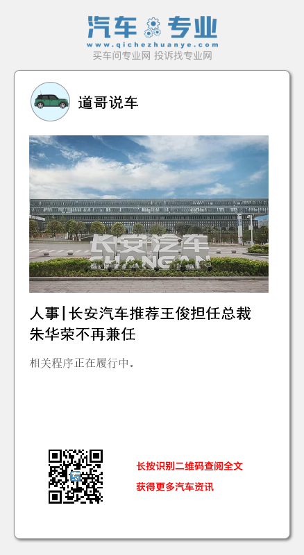 日前,道哥说车获悉,重庆长安汽车股份有限公司(以下简称长安汽车)控股股东中国兵器装备集团有限公司,已推荐王俊担任长安汽车总裁。长安汽车董事长、党委书记朱华荣将不再兼任长安汽车总裁。相关程序正在履行中。