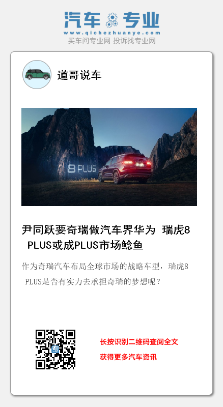 按照奇瑞的计划,作为基于全球标准打造的旗舰级SUV,奇瑞汽车布局全球市场的战略车型,瑞虎8 PLUS的意图之一就是占领国际市场,进一步向世界级品牌的愿景靠近。尹同跃曾说过“任何一家车企没有中国市场不大,没有国际市场不强”。在10月15日瑞虎8 PLUS上市发布会上他又提出,奇瑞汽车要做汽车界的华为,在核心技术上不断突破,在海外市场不断拓展。可见奇瑞汽车的眼睛一直在盯着海外市场。