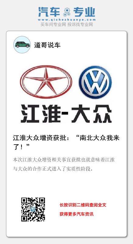 日前,江淮汽车发布公告称,公司接到江淮大众的通知,江淮大众增资相关事宜已获得安徽省发展改革委备案通过。