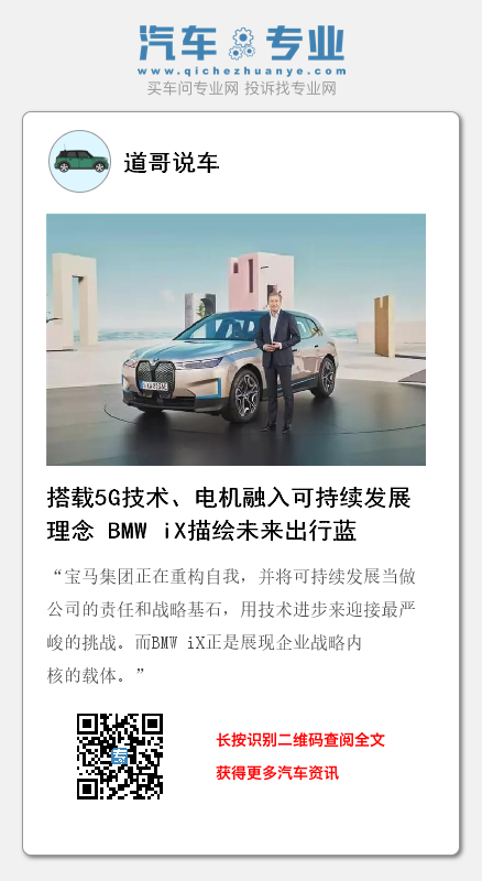 宝马对BMW iX的评价是“最智能BMW汽车”,作为最智能的BMW汽车,创新纯电动BMW iX在电子电器架构、自动驾驶功能、显示和操控系统以及内部装备全方位创新,是宝马集团首款使用5G技术的车型,将宝马带到一个全新高度。在5G的基础上,BMW iX采用了宝马集团全新一代数字化架构和感应器系统,数据处理能力是目前车辆的20倍。随着该款车型的推出,宝马集团将全面开启新能源攻势的新阶段,而该款车型采用的模块化、可拓展的相应技术也将逐步应用于集团旗下未来的其他车型上。