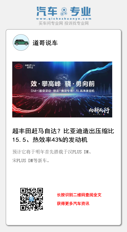 近日,在插电混动领域浸淫多年的比亚迪又自主研发出了超低油耗的DM-i超级混动技术的核心部件——骁云-插电混合动力专用的1.5L高效发动机。据悉,骁云-插混专用1.5L高效发动机专为DM-i超级混动技术打造。它以实现超低油耗为开发目标,热效率高达恐怖的43%,是全球热效率最高的量产汽油发动机,与此同时压缩比也达到了恐怖的15.5,在业内属于天花板。这款发动机不仅超级节油,轻松满足“国六b”排放标准,还以出色的NVH性能带来平顺静谧的驾驶享受,更重要的是它能让用户大大降低用车成本,最终给消费者带来实惠。预计它将于明年首先搭载于汉PLUS DM、宋PLUS DM等新车。