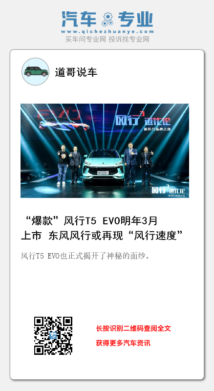值得一提的是,据介绍,在量产前,风行T5 EVO历经坑洼路、石块路、搓板路等十余种高强度工况试验,强化道路试验累计20万公里,模拟用户场景道路试验累计100万公里,相当于环绕中国边境32圈。结合尤峥的说法看,风行T5 EVO将是一个在质量方面非常值得信赖的产品。