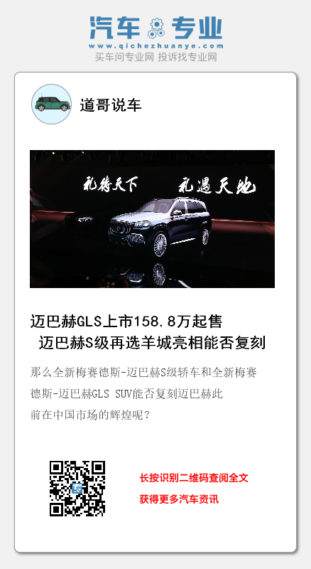 2020年11月19日晚,在主题定为“‘礼’道非凡”的2020年“梅赛德斯-迈巴赫之夜”上,全新梅赛德斯-迈巴赫S级全球首次亮相,与此同时全新梅赛德斯-迈巴赫GLS SUV正式登陆中国市场,带来全新梅赛德斯-迈巴赫GLS 600 4MATIC礼尚版、全新梅赛德斯-迈巴赫GLS 600 4MATIC礼乐版以及全新梅赛德斯-迈巴赫GLS 480 4MATIC三款车型,零售价格分别为人民币2,738,000元、2,158,000元与1,588,000元。此外,迈巴赫表示未来将推出纯电车型。也许广州车展的前夜,正是属于迈巴赫的,毕竟这是一个提及名字就会在很多人心中产生震动的品牌。