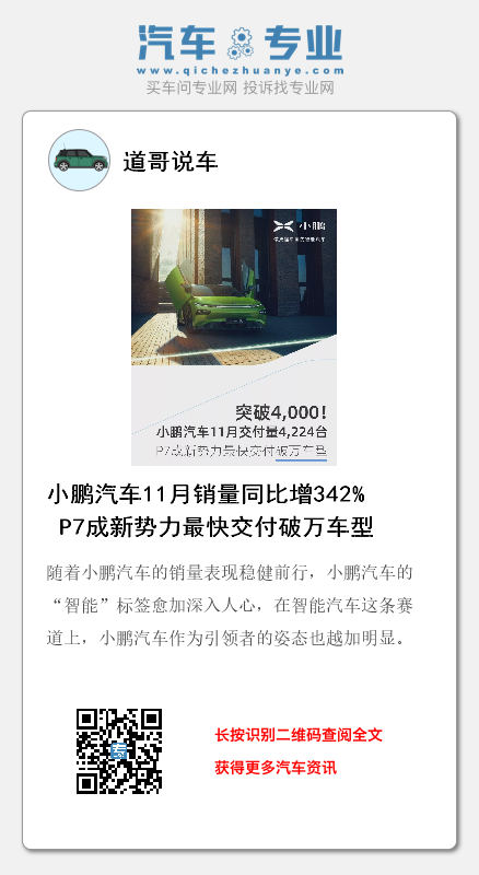 近日,道哥说车从小鹏汽车官方获悉,11月小鹏汽车交付量达到4,224台,同比增长342%,创2020年新高;2020年1-11月累计交付21,341台,同比增长87%;小鹏P7单月交付量2,732台,环比增长30%,刷新单月交付数记录;自今年6月底启动规模交付以来,已累计交付11,371台,创下新势力品牌单车型交付破万量最快纪录;小鹏G3单月交付1,492台,环比增长59%,创2020年新高。
