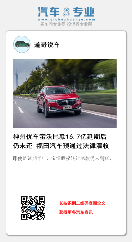 福田汽车于1月4日公告“未收到尾款”也就意味着即使是延期半年,宝沃股权转让尾款仍未到账。对此,福田汽车表示:正在积极与债务人及担保人协商还款计划及增补担保措施方案,并将采取法律手段清收债权。