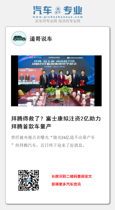 1月4日,有消息称,拜腾汽车与富士康科技集团、南京经济技术开发区签署战略合作框架协议,合力推进拜腾新能源整车产品产量,力争在2022年第一季度实现拜腾首款车型M-Byte的量产工作。据悉,富士康拟注资2亿美元,助力拜腾汽车重回赛道。与此同时,根据协议,富士康将提供先进的制造技术、运营管理经验和产业链资源,全方位支持拜腾首款车型M-Byte的量产制造工作。