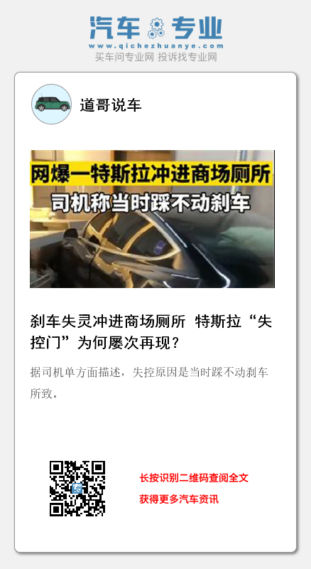 1月4日,山东临沂泰盛广场,一辆特斯拉失控冲进商场厕所,把洗手台撞坏。据司机单方面描述,失控原因是当时踩不动刹车所致。