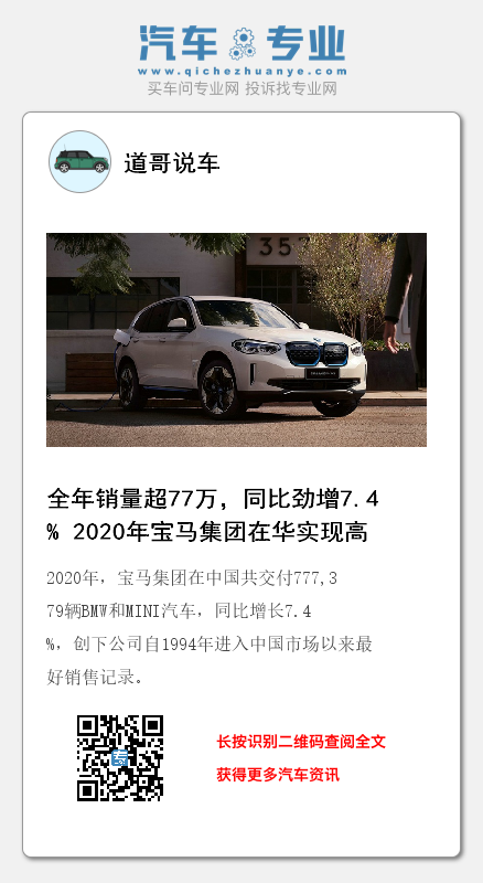2020年,面对疫情的严峻考验以及国际环境的复杂多变等诸多“不确定性”,宝马集团在中国展现出强大的韧性并实现全面高质量发展,在电动出行、本土数字化创新、产品及服务等方面均表现出综合实力。2020年,宝马集团在中国共交付777,379辆BMW和MINI汽车,同比增长7.4%,创下公司自1994年进入中国市场以来最好销售记录。