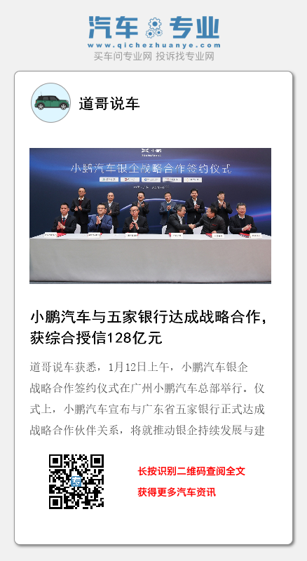 道哥说车获悉,1月12日上午,小鹏汽车银企战略合作签约仪式在广州小鹏汽车总部举行。仪式上,小鹏汽车宣布与广东省五家银行正式达成战略合作伙伴关系,将就推动银企持续发展与建设开展合作。
