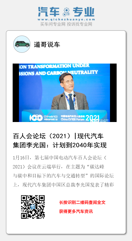 1月16日,第七届中国电动汽车百人会论坛(2021)会议在云端举行,在主题为“碳达峰与碳中和目标下的汽车与交通转型”的国际论坛上,现代汽车集团中国区总裁李光国发表了精彩演讲。以下内容为现场演讲实录: