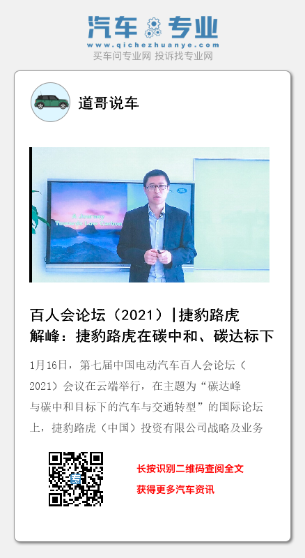 1月16日,第七届中国电动汽车百人会论坛(2021)会议在云端举行,在主题为“碳达峰与碳中和目标下的汽车与交通转型”的国际论坛上,捷豹路虎(中国)投资有限公司战略及业务发展执行副总裁解峰发表了精彩演讲。以下内容为现场演讲实录: