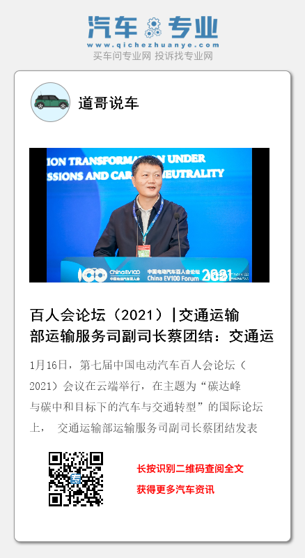 1月16日,第七届中国电动汽车百人会论坛(2021)会议在云端举行,在主题为“碳达峰与碳中和目标下的汽车与交通转型”的国际论坛上, 交通运输部运输服务司副司长蔡团结发表精彩演讲。以下内容为现场演讲实录: