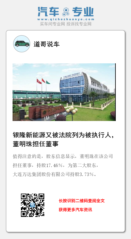 资料显示,银隆新能源股份有限公司成立于2009年12月,注册资本约11亿,法定代表人为赖信华,经营范围含新能源相关领域技术的研究开发;锂离子动力电池和储能电池的生产、销售;混合动力、纯电动车动力总成、电机、电源管理系统及相关领域的技术开发等。值得注意的是,股东信息显示,董明珠在该公司担任董事,持股17.46%,为第二大股东,大连万达集团股份有限公司持股3.73%。