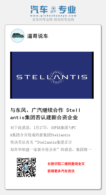 对于此消息,1月17日,由PSA集团与FCA集团合并组成的新集团Stellantis坚决否认有关“Stellantis集团正计划在华创建一家新合资企业”的消息。集团将一如既往地致力于同目前的合作伙伴——东风汽车集团和广汽集团的合作。