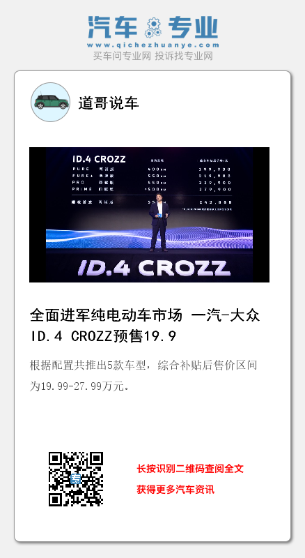 一汽-大众副总经理(商务)及销售公司总经理郭永锋在发布会现场表示:“ID.4 CROZZ是一汽-大众在汽车行业转型变革过程中,历经六年时间打造的一款集电动化、智能化、网联化、个性化为一体的全新产品。这也是大众集团作为全球最大车企,在中国投放的最重要的首款MEB产品,今夜也将真正开启中国汽车电动化时代。”