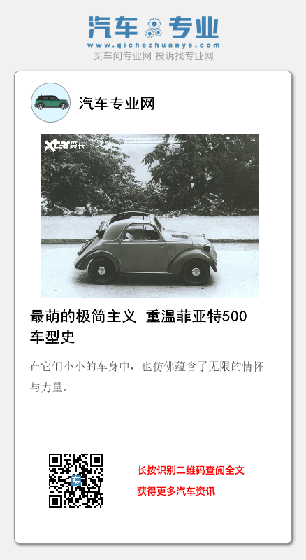编辑点评:历史所孕育的情怀以及良好的群众基础,令菲亚特重燃了复活500系列的热情。2007年,全新一代车型再次驶下了生产线。三年后,菲亚特500以进口身份引入国内,至此这一经典的意大利国民车,终于在诞生54后行驶在了中国的道路上。