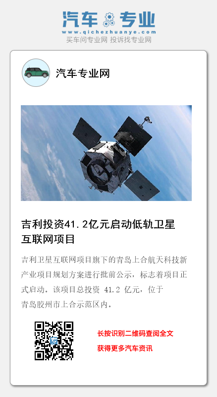 1月26日,据青岛日报报道,吉利卫星互联网项目旗下的青岛上合航天科技新产业项目规划方案进行批前公示,标志着项目正式启动。该项目总投资 41.2 亿元,位于青岛胶州市上合示范区内。