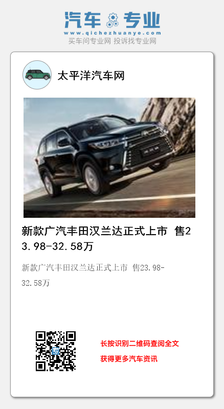 新款广汽丰田汉兰达正式上市 售23.98-32.58万