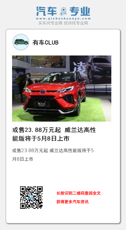 日前,我们从相关渠道获悉,广汽丰田威兰达高性能版车型将于5月8日正式上市。动力上,新车搭载一套由2.5L阿特金森循环发动机与电动机组成的插混系统,百公里综合油耗仅为1.1升。有消息指出,新车的预售价或为23.88万元起。