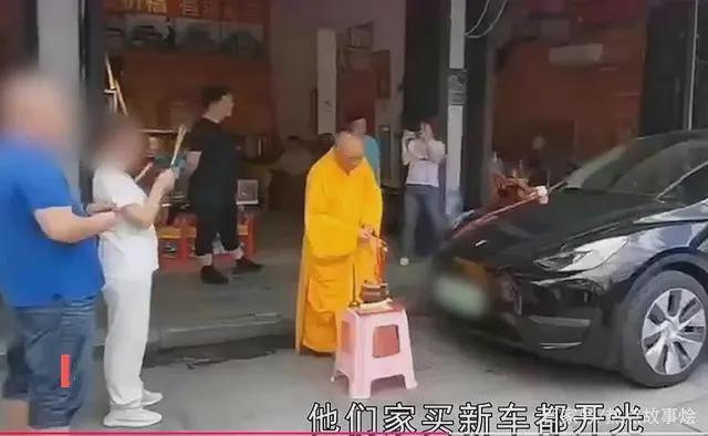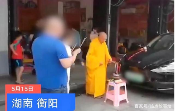5月15日,湖南衡阳衡山南岳大庙附近的一家香行门口,有人为一辆黑色特斯拉“开光”。一段视频显示,一名身着黄色僧袍的男子,站在特斯拉车头烧香点蜡。特斯拉旁边还站着一男一女,手里也分别拿着竹立香。据知情者介绍,视频中的一男一女每次买新车都会来这里开光。