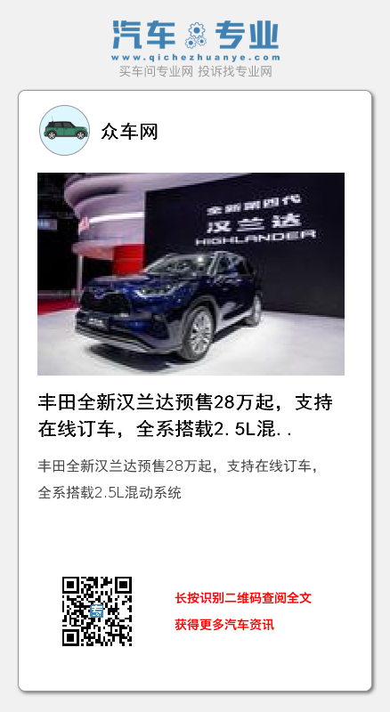 6月1日,丰田官方正式宣布全新第四代汉兰达开启预售,预售价为28-37万元,用户可在丰云行APP在线订车,开通线上渠道也避免了经销商加价销售的行为,预计这款车将在6月底正式上市。