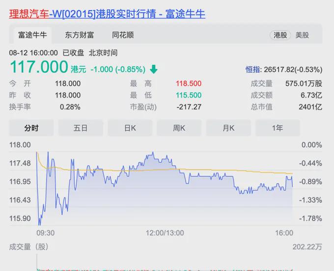 但遗憾的是,在登陆港股市场后,资本市场并没有对理想汽车产生狂热的态度,理想汽车以118港元/股开盘,半小时后便跌至115港元/股。截至收盘,理想汽车股价为117港元/股,下跌0.85%,未追平发行价。