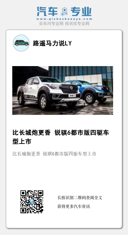 近日获悉,锐骐6都市版四驱车型已经正式上市,一共包含了5MT汽油动力、6MT和8AT柴油动力等多种版本,官方指导价在12.68-15.68万元之间。