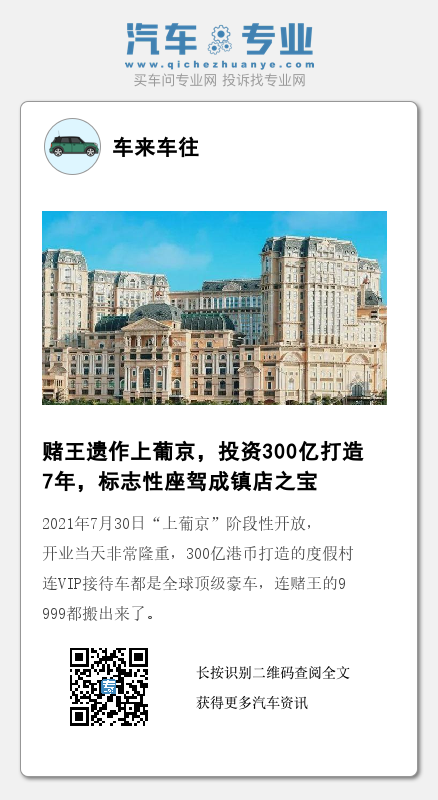 澳门上葡京是赌王何鸿燊遗作,于2014年动土,这个综合度假村耗资300亿港币打造了7年,可谓是非常的气派。2021年7月30日“上葡京”阶段性开放,开业当天非常隆重,300亿港币打造的度假村连VIP接待车都是全球顶级豪车,连赌王的9999都搬出来了。