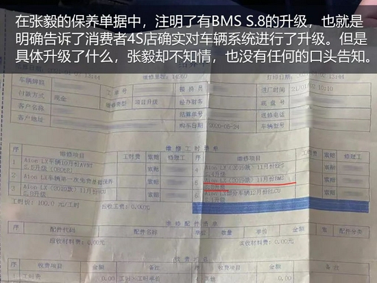 张毅车辆的“锁电”,是在一次4S店的保养中“秘密”进行的。在张毅的保养单据中,注明了有BMS S.8的升级,也就是明确告诉了消费者4S店确实对车辆系统进行了升级。但是具体升级了什么,张毅却不知情,也没有任何的口头告知。张毅说自己的车每次保养都会有BMS的升级,但是他从来不清楚升级对车辆什么性能有提升和改进,这次被“锁电”同样是在不知情的情况下。