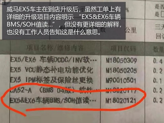 田强回想后发现,之前去店面的升级项目都会有明确的告知,而这次却没有。虽然在项目升级后工单上有详细的内容明示 “EX5&EX6车辆BMS/SOH值读…”,但并没有更详细的解释,也没有工作人员告知这是什么意思。