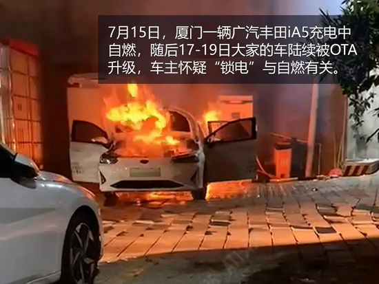 据李刚描述,今年7月15日,厦门发生一起广汽丰田iA5充电中自燃事件,紧接着从7月17-19日这段时间,iA5车主的车陆续开始自动OTA升级。