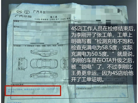 李刚是另外一位遭遇“锁电”的广汽丰田iA5车主,他比王勇更早前往4S店检测。当时这家4S店还不像如今这般“敏感”。4S店工作人员在检修结束后,为李刚开了一张工单,工单上明确写着“检测充电不饱和,检查充满电应为58.5度,实际充满电为50.5度。”也就是说,李刚的车也是在OTA升级之后,被“锁电”了,李刚比王勇更幸运,因为4S店给他开了工单证明。不过,李刚也向车市物语透露,由于后来越来越多的车主向4S店提出检测需求,4S店觉察到了问题的严重性,决定不再为用户提供任何的证明,而且对新来访的车主摆出一副毫不知情的姿态。