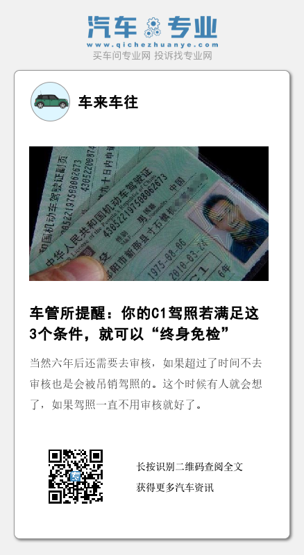 最后,如果你有一本10年有效期的驾照,并且每次记分周期没有超过12分,再去参加年检时,车管所就会给我们换上一张终身免检的驾照了。