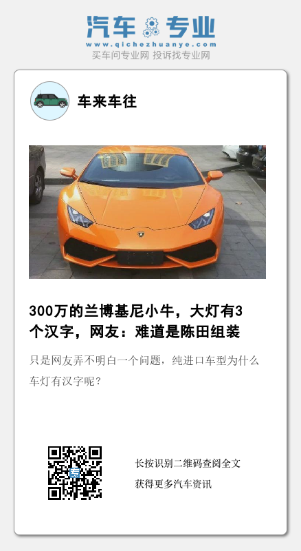兰博基尼Huracan是兰博基尼入门级跑车,俗称小牛,国内指导价254万到390万之间,即便是买入门级丐版,落地价也要小300万了,绝对是豪车中的豪车,只是网友弄不明白一个问题,纯进口车型为什么车灯有汉字呢?