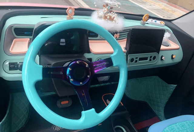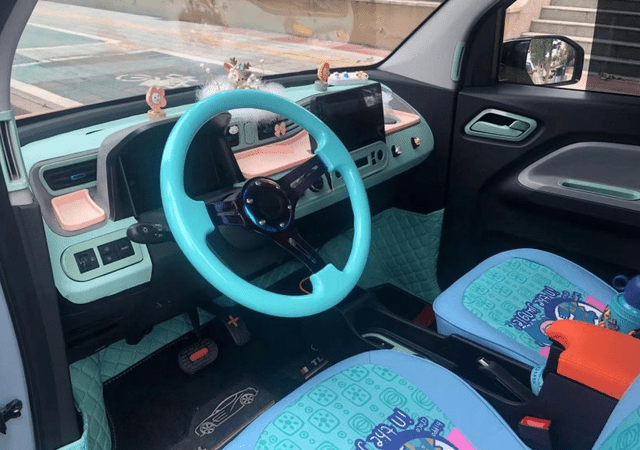 于是,小梅就在网上订了车膜、车贴,以及座椅套、内饰套件、方向盘等。由于动手能力比较差,所以小梅直接找了修车店的朋友帮忙,所以即便她的宏光MINIEV看起来改变很大,其实总共才花了2千多块钱,非常划算。