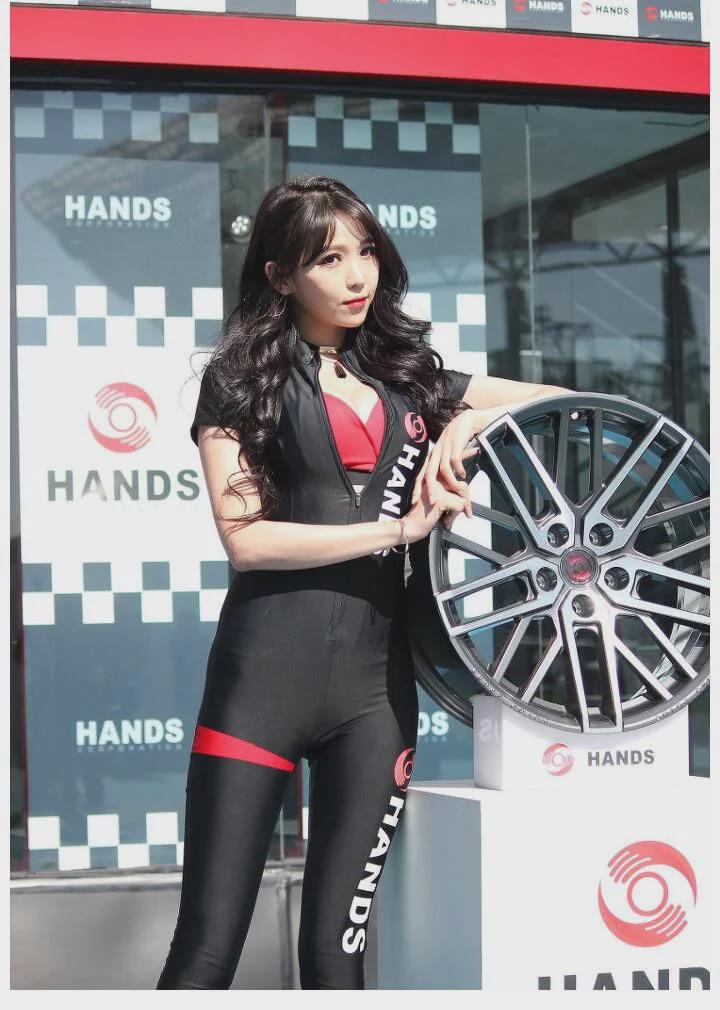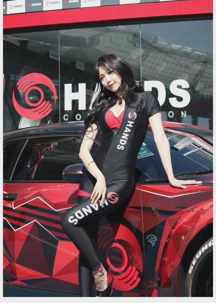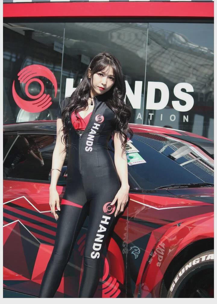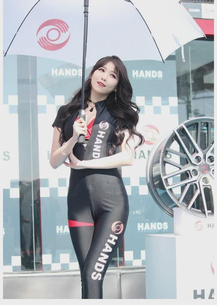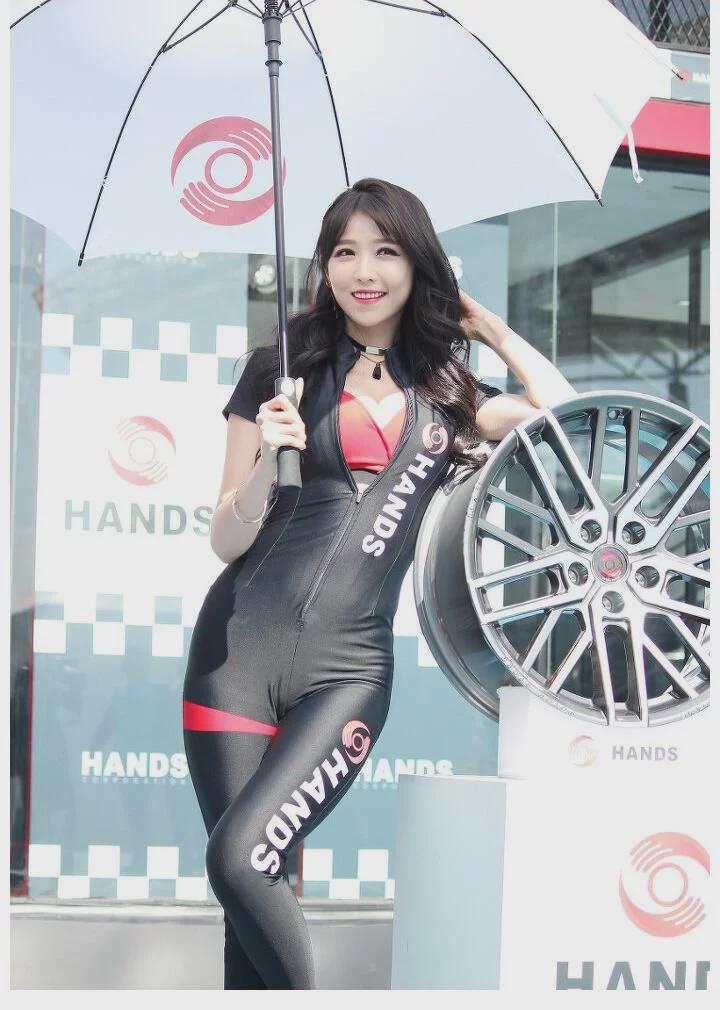 一般连体紧身衣往往出现在改装车展或者是赛车比赛上,尤其是室外的展会,配上一把伞还是非常好看的。