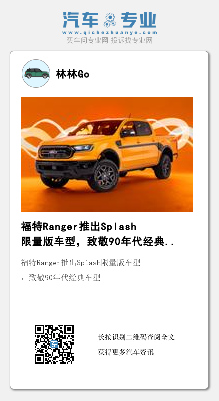 近日,林林Go从海外媒体获悉,福特将推出2022款福特Ranger Splash套件以及Splash限量版车型。该套件高度还原了90年代福特Ranger Splash定制版车型,作为选装配件,售价1495美元,预计将于年底开始供应。